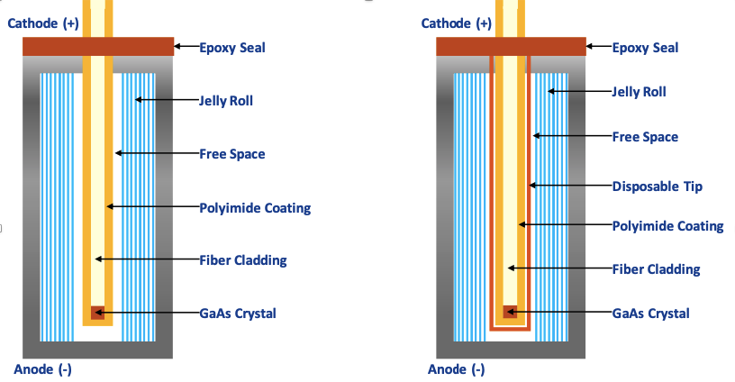 光纖溫度傳感器可以在單元形成階段或之后安裝。與在制造的電池芯上安裝傳感器相比,在電池形成階段安裝傳感器很簡單。下面的圖1顯示了如何將光纖溫度傳感器安裝到圓柱形電池芯中的詳細視圖。