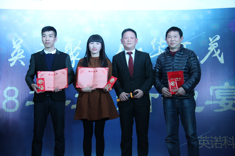 ▲五周年特別貢獻獎 由董事長程總頒發(fā)證書及獎金 授予榮譽人員:陳斌、林水英、程琥(從左至右排序)